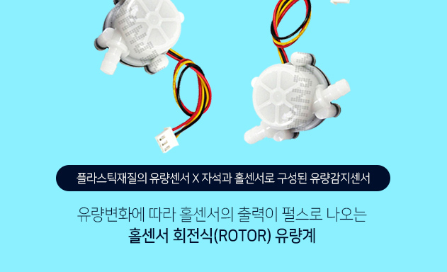 유량센서는 플라스틱 재질 이며, 유량감지센서는 자석과 홀센서로 구성되어 있습니다.. 내부 구조는 유량을 감지하는 로터(ROTOR)와 자석, 홀센서로 이루어져 있으며, 유량 변화에 따라 홀센서의 출력이 펄스로 나옵니다.