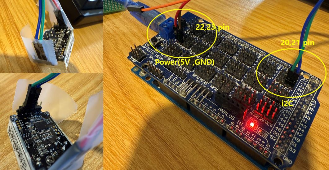 우선 변수를 줄이기 위해서 아두이노 메가 센서 쉴드 보드 빼고 오리지널 아두이노 메가 2560보드에 전원(5V, GND)와 라이브러리로 다운받은 코드 그래도 사용하여 i2C는 20,21번핀을 연결하였습니다. 결과적으로 아두이노IDE에서 시리얼 모니터와 Cubic CM Sensor monitor둘다에서 아무런 신호를 받지 못하고 있습니다.