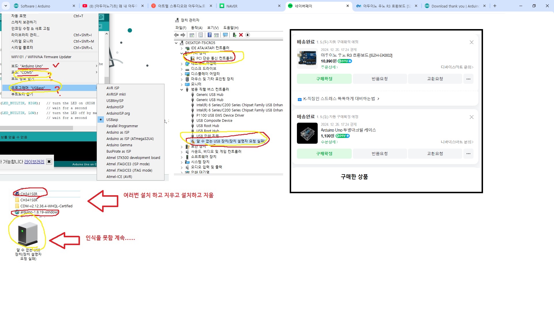 아두이노 우노 R3 를 두개 구매했습니다. 그런데 두개 모두 장치관리자에서 포트 번호가 인식이 안되고 Unknown Device 로 나옵니다. 제품 설명에는 드라이버를 설치할 필요가 없이 인식된다고 되어있는데 왜 인식이 안될까요? CH340 드라이버를 사용하는 저가 우노 보드도 인식은 잘 되었었는데 이렇게 두개 모두 인식이 안되는 경우는 처음 입니다. 답변...