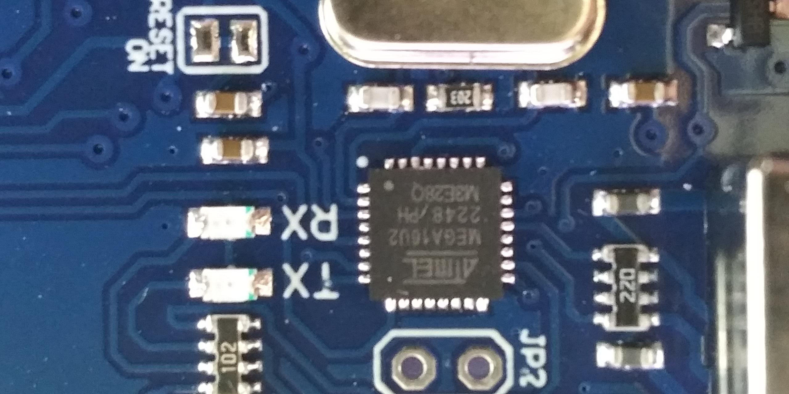문의를 하고나서 보드를 자세히 들여다 보았는데요, 통신 인터페이스 칩 ( MEGA16U2 ) 조립이 거꾸로 되어있는 것 같습니다. 1 번 핀 마크가 잘 못 되어있는 것으로 보임. 제품 확인 바랍니다.