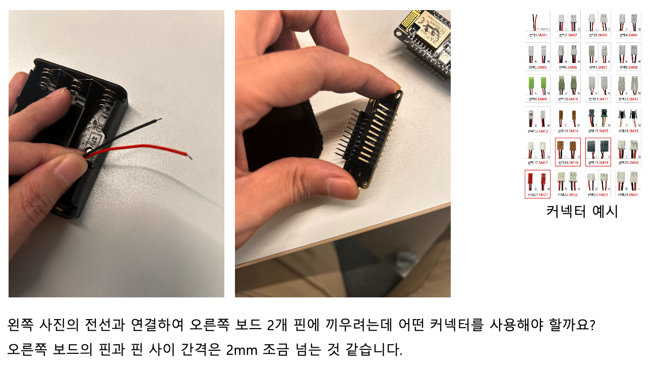 안녕하세요, 홈페이지 보고 제품 관련한 문의사항이 있어서 메일드립니다. 아래의 사진처럼 왼쪽 배터리 홀더의 전선과 오른쪽 보드의 2개 핀 연결이 필요합니다. 혹시 어떤 커넥터를 사용하면 되는지 알려주실 수 있을까요? ===============================================================================...