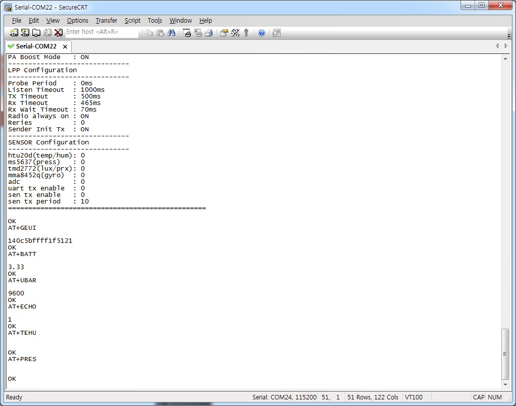 AT SENSOR COMMAND 문의 제품 설명대로 센서를 HW ON 하고 센서값을 읽으려 했으나 USER GUIDE 와 다르게 나옵니다. 다른 AT 명령어들은 정상적으로 동작하는듯 합니다. 확인하시고 회신부탁드립니다.