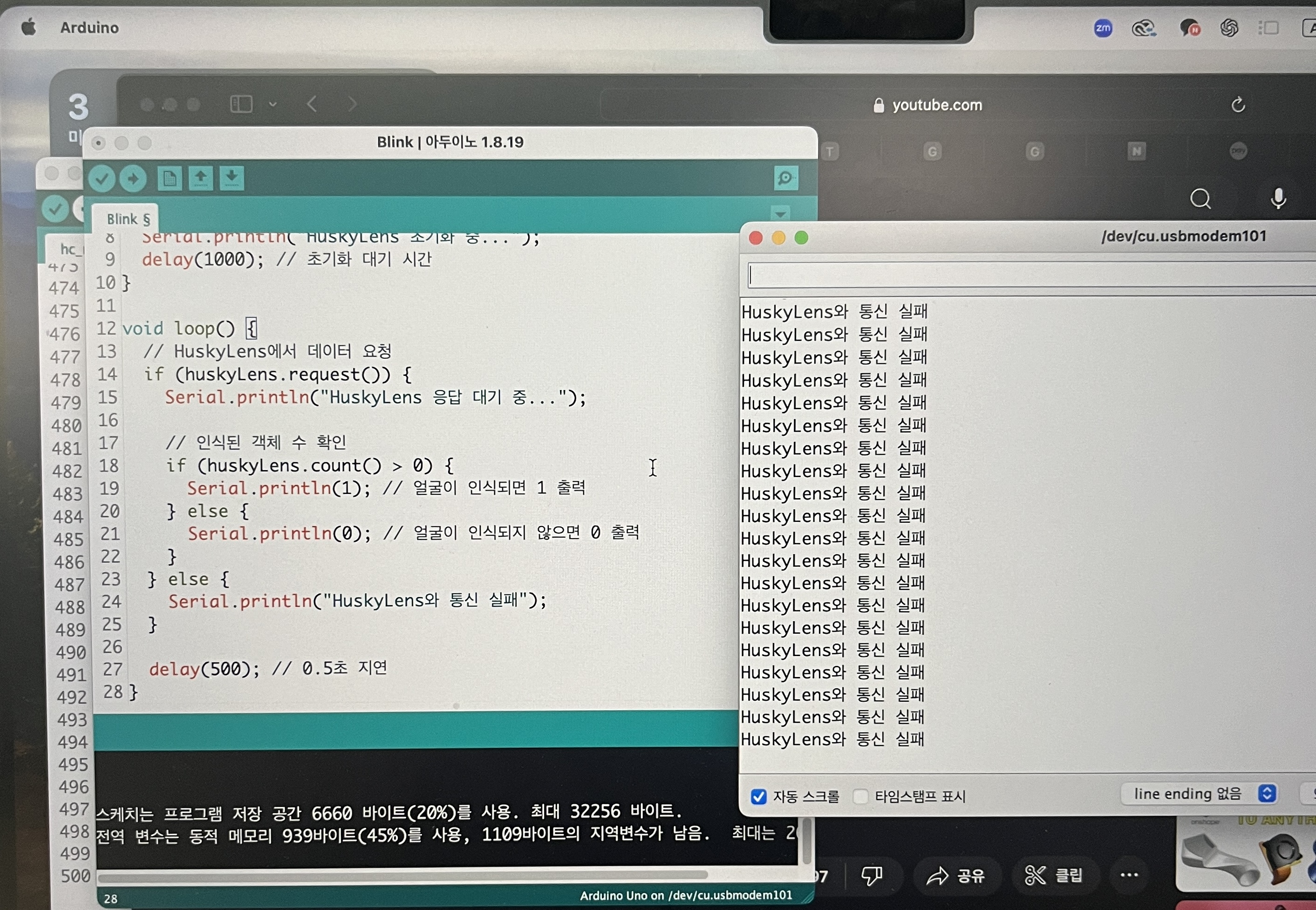 방금 개봉한 허스키 렌즈인데 작동 불량입니다. 제가 2개를 사서 한개를 먼저 잘쓰다가 그게 고장이나서 백업용으로 가지고있던 1개를 방금 개봉해서 아두이노 통신 테스트를해보니 계속 실패합니다. 아두이노 우노 정품사용했고, 점퍼 케이블도 Dfrobot사 케이블 사용했습니다. RX, TX핀도 바꾸면서 코드 수정해서 여러번 테스트해봤고, Serial 9600잘 설...