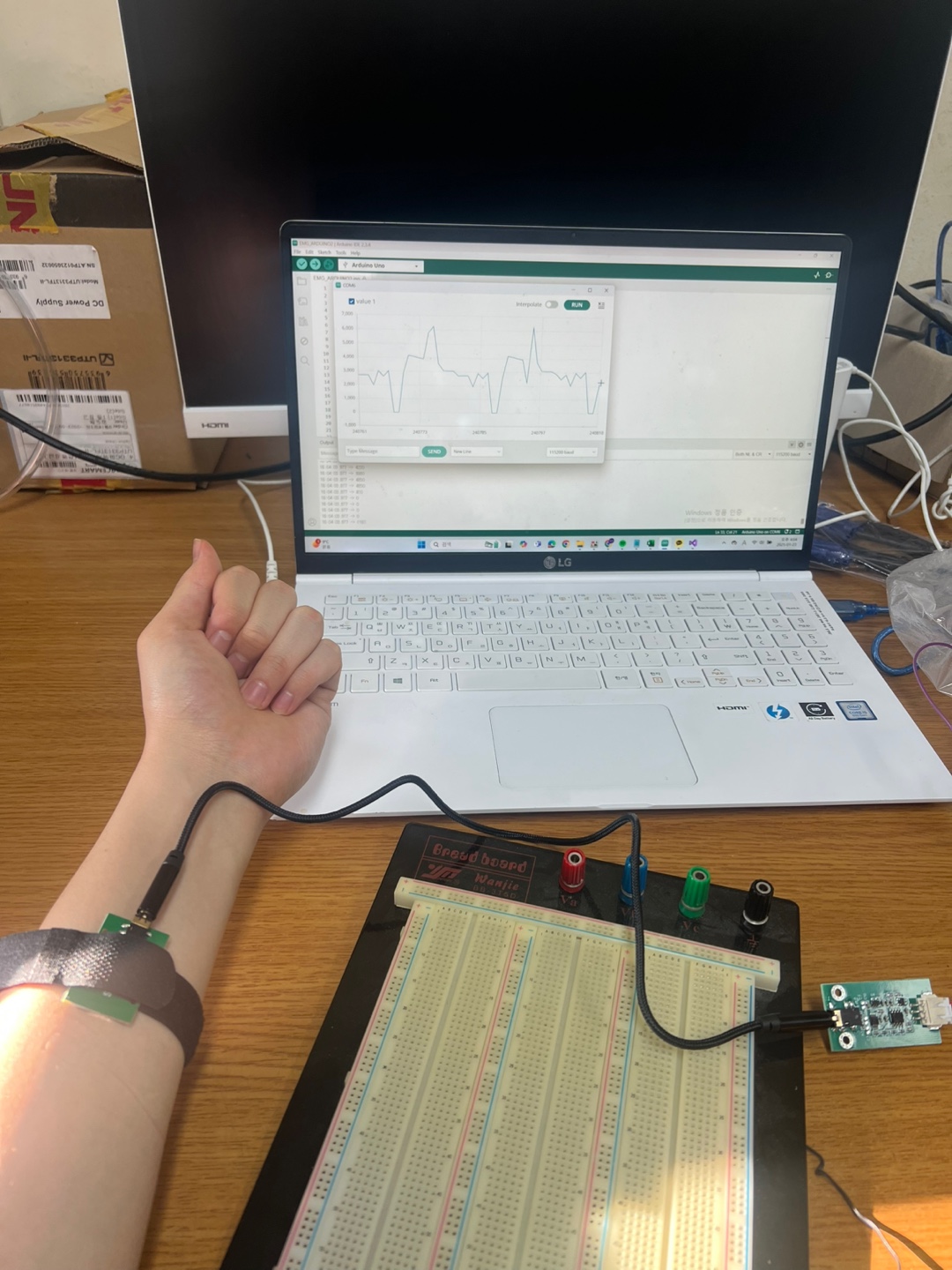 emg센서가 쥐고 펴는상황에서 값이 변화하지않습니다. 예시2번에서 보여주는 파형과 같이 나오는것을 목표로하였고 기술지원문의에 나와있는 문의내역을 보며 적절한 위치를 찾아 계속해보았지만 손을 쥘때랑 펼때랑 값이 차이가 나지않습니다 선 연결에 문제가 없으며 꽉진 상태에서 STOP을 해놓고 파형을 본 상태입니다. 센서를 부착한 위치가 문제라고 하시면 부착한 위치...