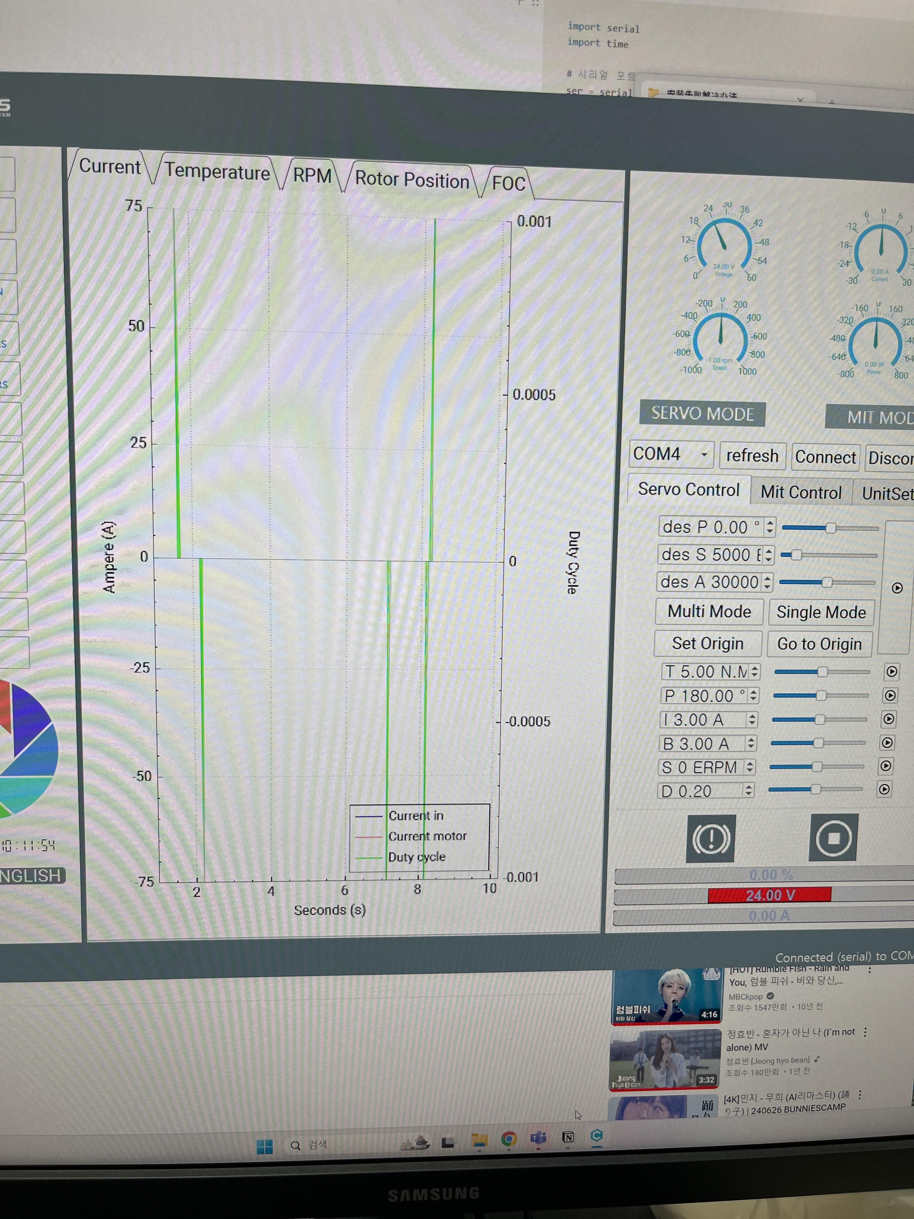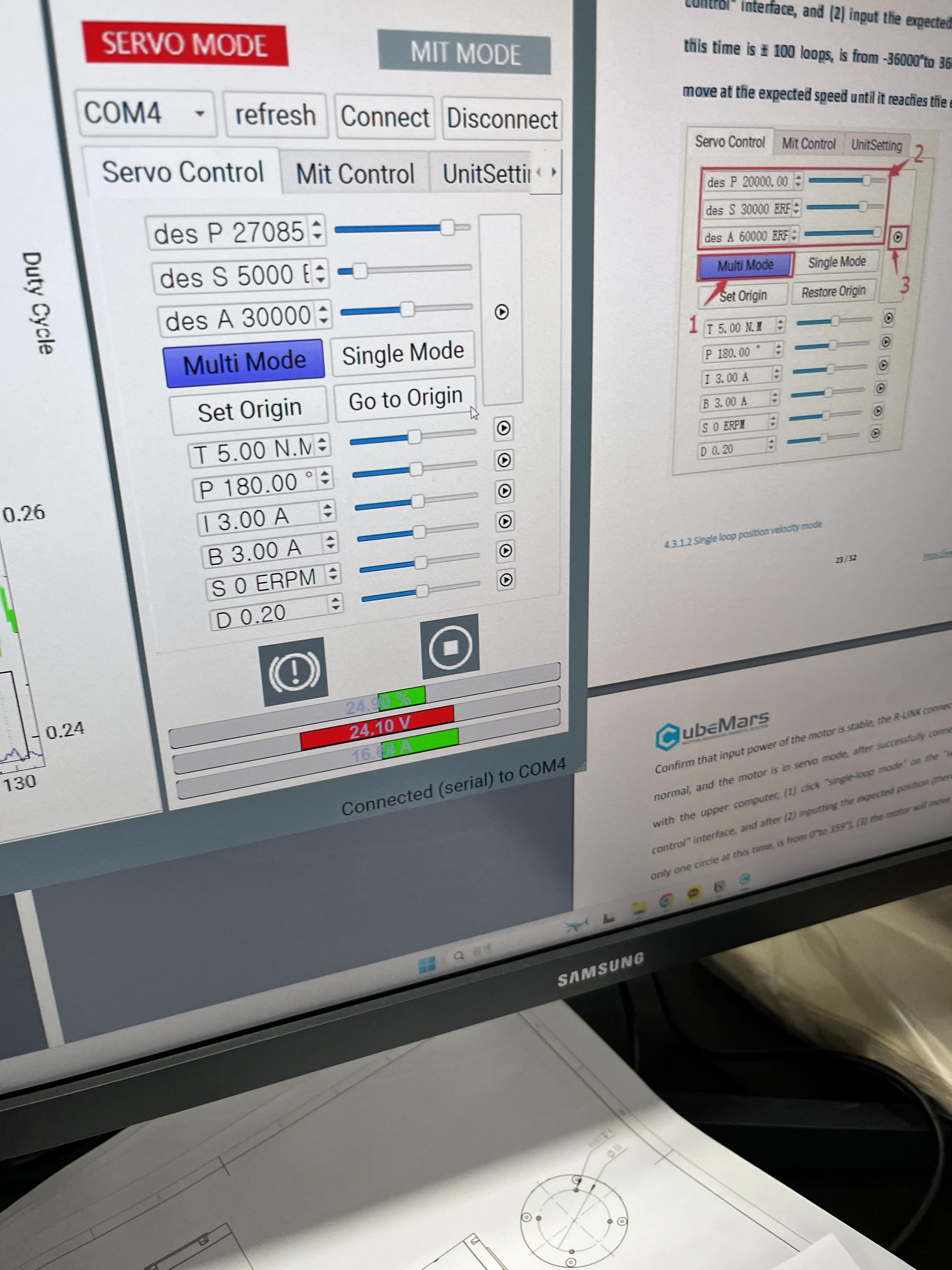 lrs-350-24 파워서플라이로 전원 사용중이구요, 매뉴얼 올려주신대로 펌웨어 업데이트와 초기 설정 후 서보 제어를 할때 내부 진동이 매우 심하고, 모터는 회전 안하고, 발열이 발생합니다..!