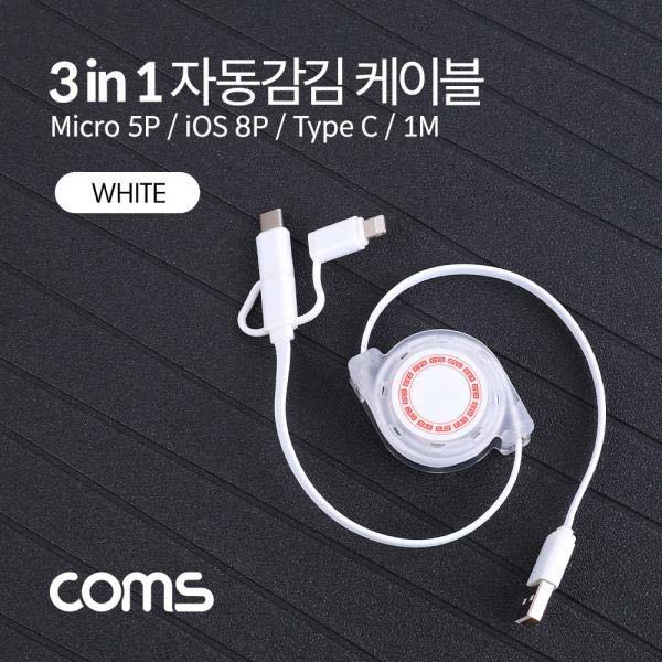 • [Coms] 스마트폰 멀티 케이블(자동감김/3 in 1), White / Type C / iOS 8Pin / Micro 5P / 1M [BB304]
