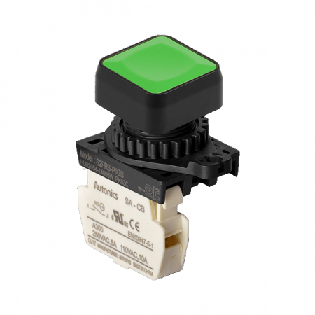• 취부경 Ø22/25 누름버튼스위치 / 외형:정사각형 / 버튼형태:[비조광형] 돌출형 / 색상:녹색 / 화살표방향:일반 / 접점블록:B접점 1개 / LED블록:없음 / 신형 접점블록