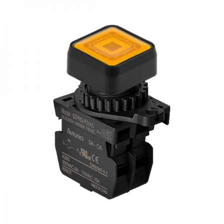 • 취부경 Ø22/25 누름버튼스위치 / 외형:정사각형 / 버튼형태:[조광형] 돌출형 / 색상:황색 / 화살표방향:일반 / 접점블록:A접점 1개 / LED블록:AC/DC 전압형 / 신형 접점블록
