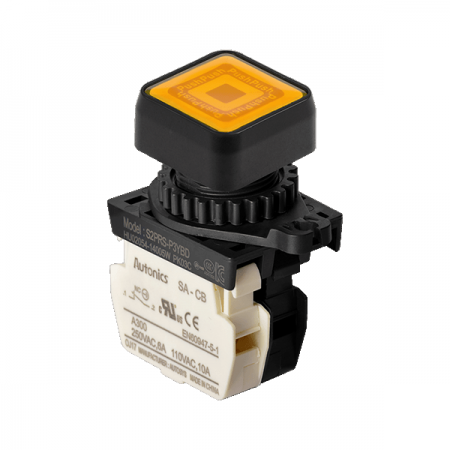• 취부경 Ø22/25 누름버튼스위치 / 외형:정사각형 / 버튼형태:[조광형] 돌출형 / 색상:황색 / 화살표방향:일반 / 접점블록:B접점 1개 / LED블록:AC/DC 전압형 / 구형 접점블록