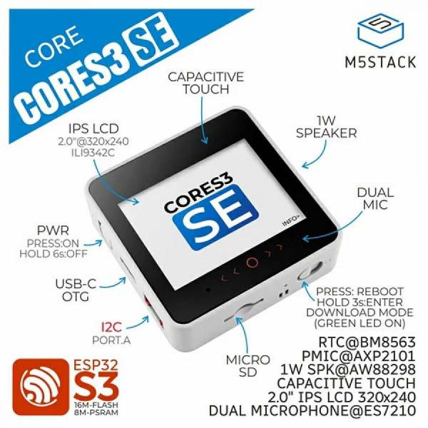 • M5CoreS3 SE: ESP32-S3 기반의 경량 IoT 개발 키트, 240MHz 듀얼코어 프로세서, 2.4G WiFi, 16MB Flash, 8MB PSRAM, 2.0인치 IPS 터치스크린, MicroSD 슬롯, 고충격 유리, AXP2101 전원 관리, OTG/CDC 지원, Arduino 및 UIFlow 호환.