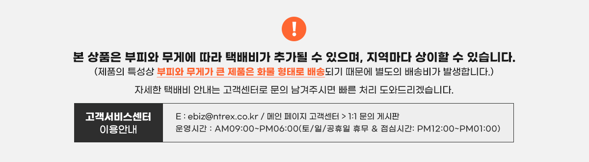 • 부피 및 무게가 10KG 이상, 총 합의 길이가 1.2M 이상 또는 배송 사정으로 인해 롯데택배 이외 타 택배로 출고될 수 있으며,