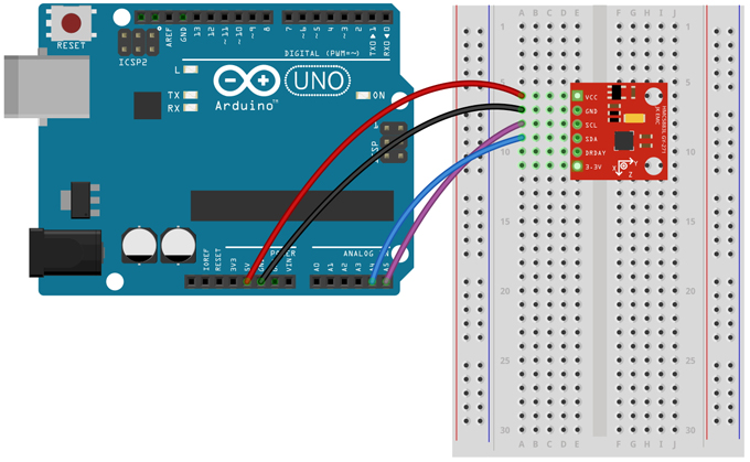 아두이노 UNO R3와 연결해서 가속도, 자이로 센터데이터 출력 하기 이번 예제에서는 인터럽트를 사용하지않기 때문에 INT핀을 연결할필요는 없다. 본 제품은 내부에 회로적으로 3.3V전원 레듈레이터와 I2C 레벨쉬프터를 내장하고 있어서 5.0V와 3.3V 에서 모두 사용이 가능 하다. STM32, 라즈베리파이 등과 같이 3.3V 전원을 사용하는 프로세서에서 사용할 경우에는 VCC 대신에 3.3V 핀을 통해서 전원을 바로 연결해 주면 된다.